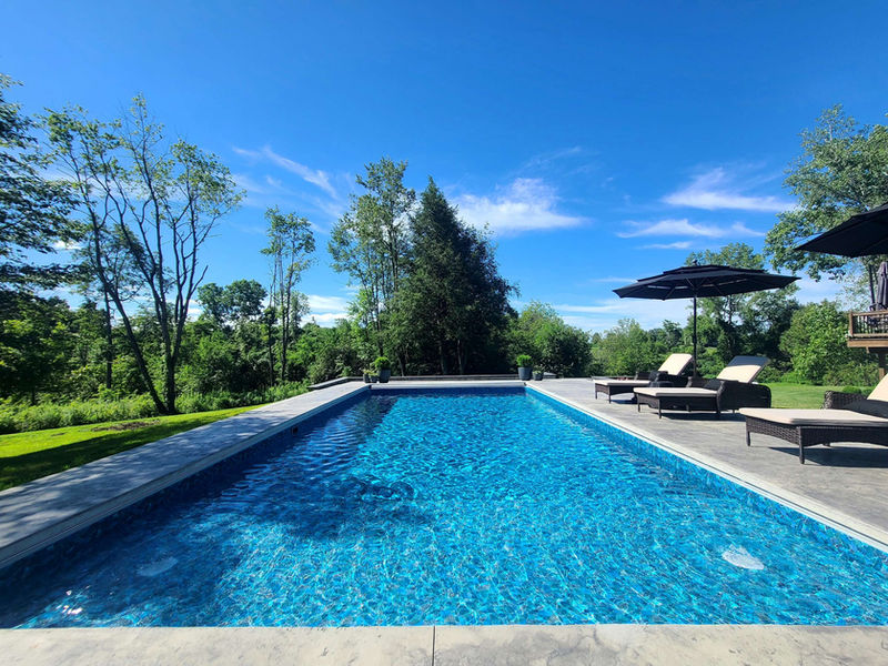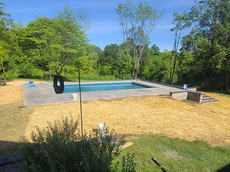 16x32 vinyl liner pool with tanning ledge. Ledge bubblers, and PAL lighting. Set into the side of a hill, this pool has a gorgeous retaining wall with a built in "grand staircase".
